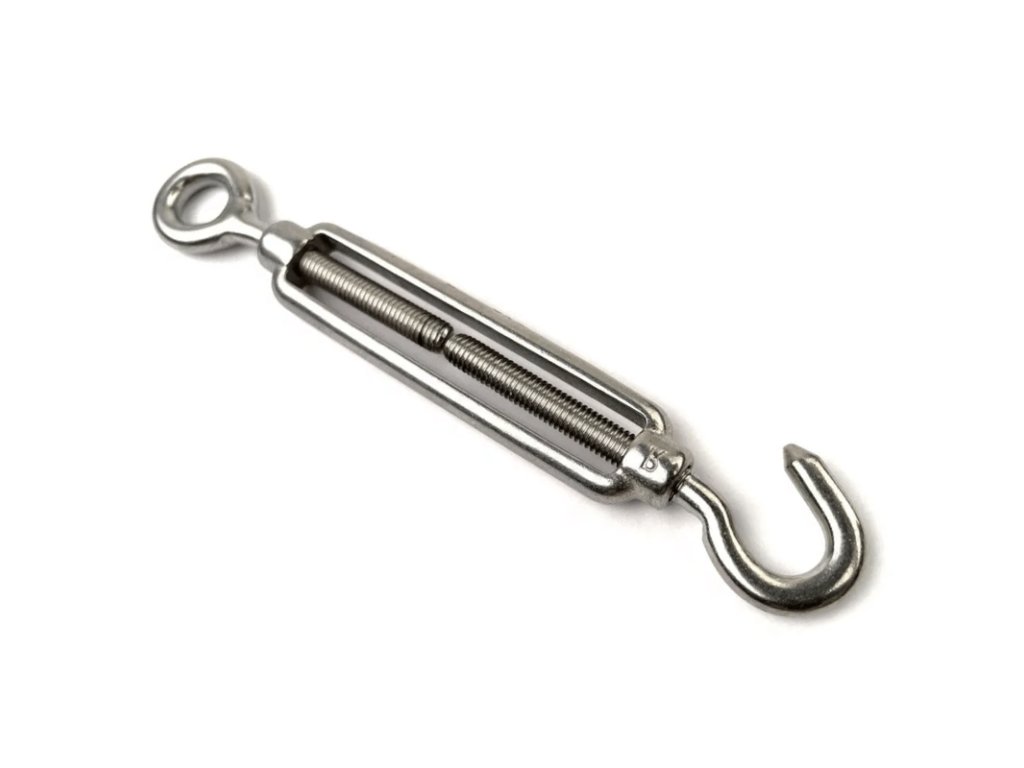 Nerezový napínač oko a hák A4 je určený na nastavovanie dĺžky napínacích systémov ako sú laná alebo spojovacie tyče. Napínač sa skladá z troch častí - oko, hák a stredový rám. Oko a hák majú závity, jeden pravý a druhý ľavý, vďaka ktorým sa dajú zaskrutkovať na konce rámu. . Napätie je možné nastavovať otočením stredného rámu. Vďaka tomu sa budú naraz povoľovať alebo doťahovať obe časti, hák aj oko, a to bez toho, aby sa pripojené napínacie systémy skrútili.
