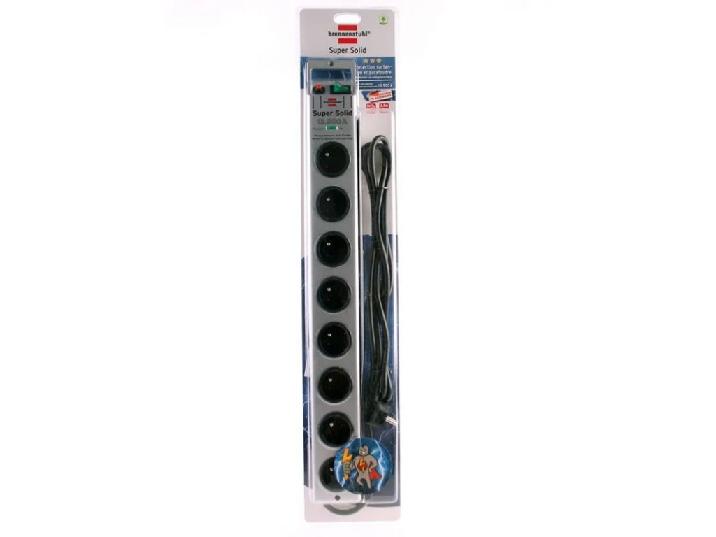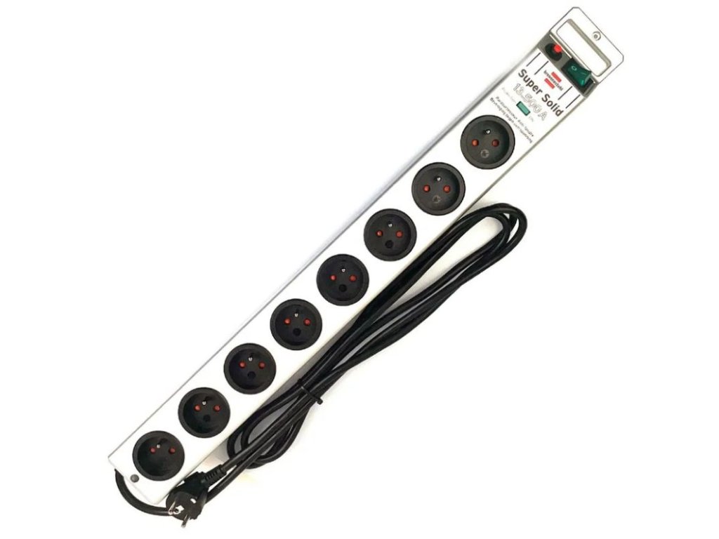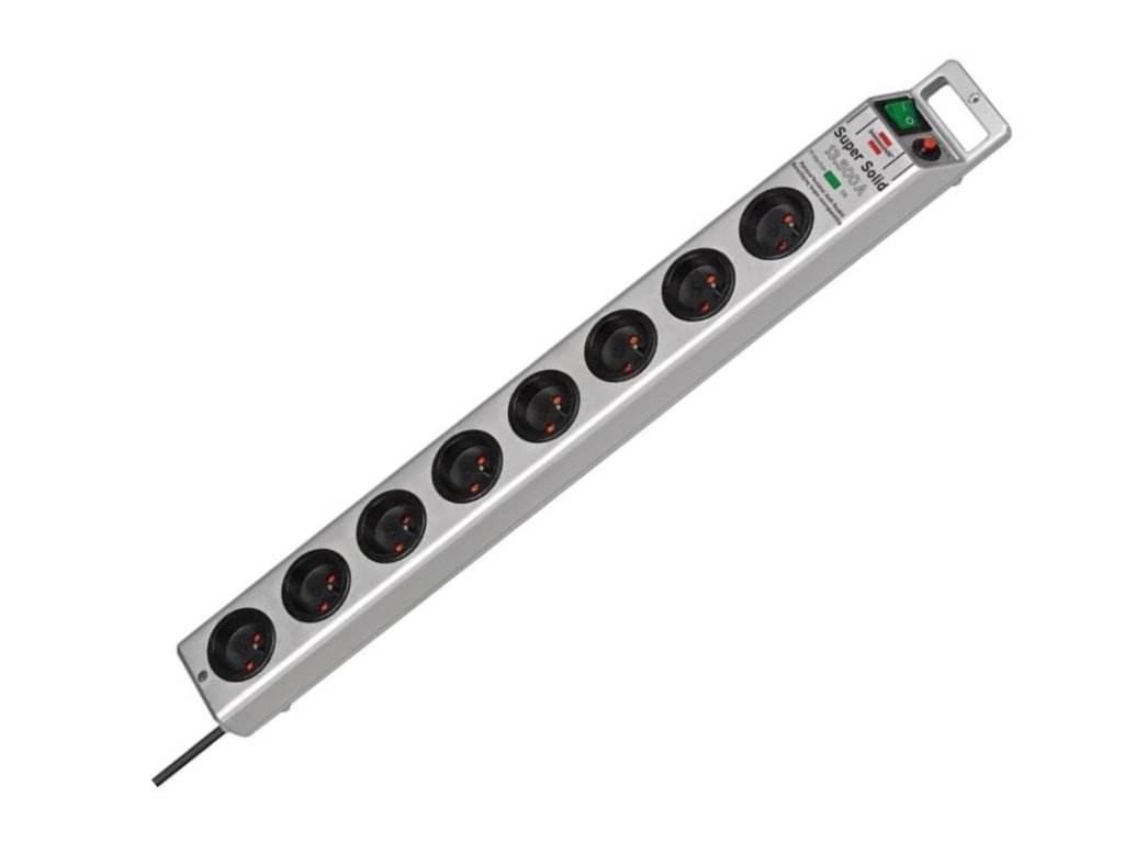 Zásuvková lišta Super-Solid s integrovanou prepäťovou ochranou 13 500 A poskytuje spoľahlivú ochranu elektronických zariadení pred prepätím v elektrickej sieti. Vďaka premyslenému rozloženiu zásuviek je vhodná aj pre väčšie sieťové adaptéry a uhlové vidlice.